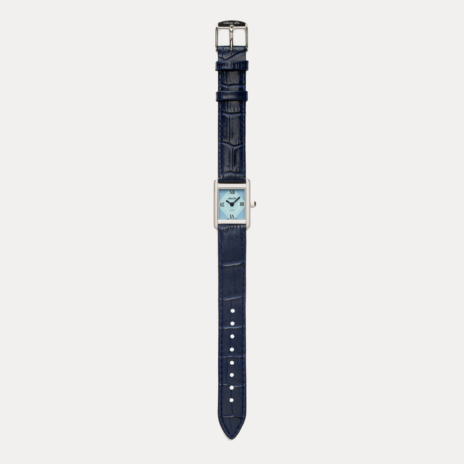 The light blue dial features a soft geometric fold texture, like layers of paper folded with care.