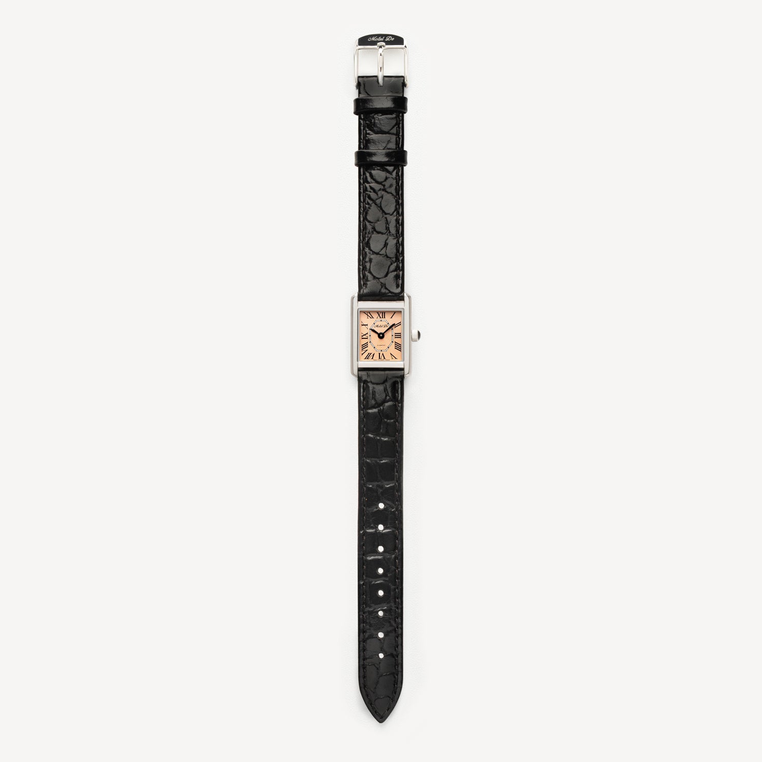 The polished rectangular stainless steel case and black leather strap complete the look — clean, balanced, and quietly confident.