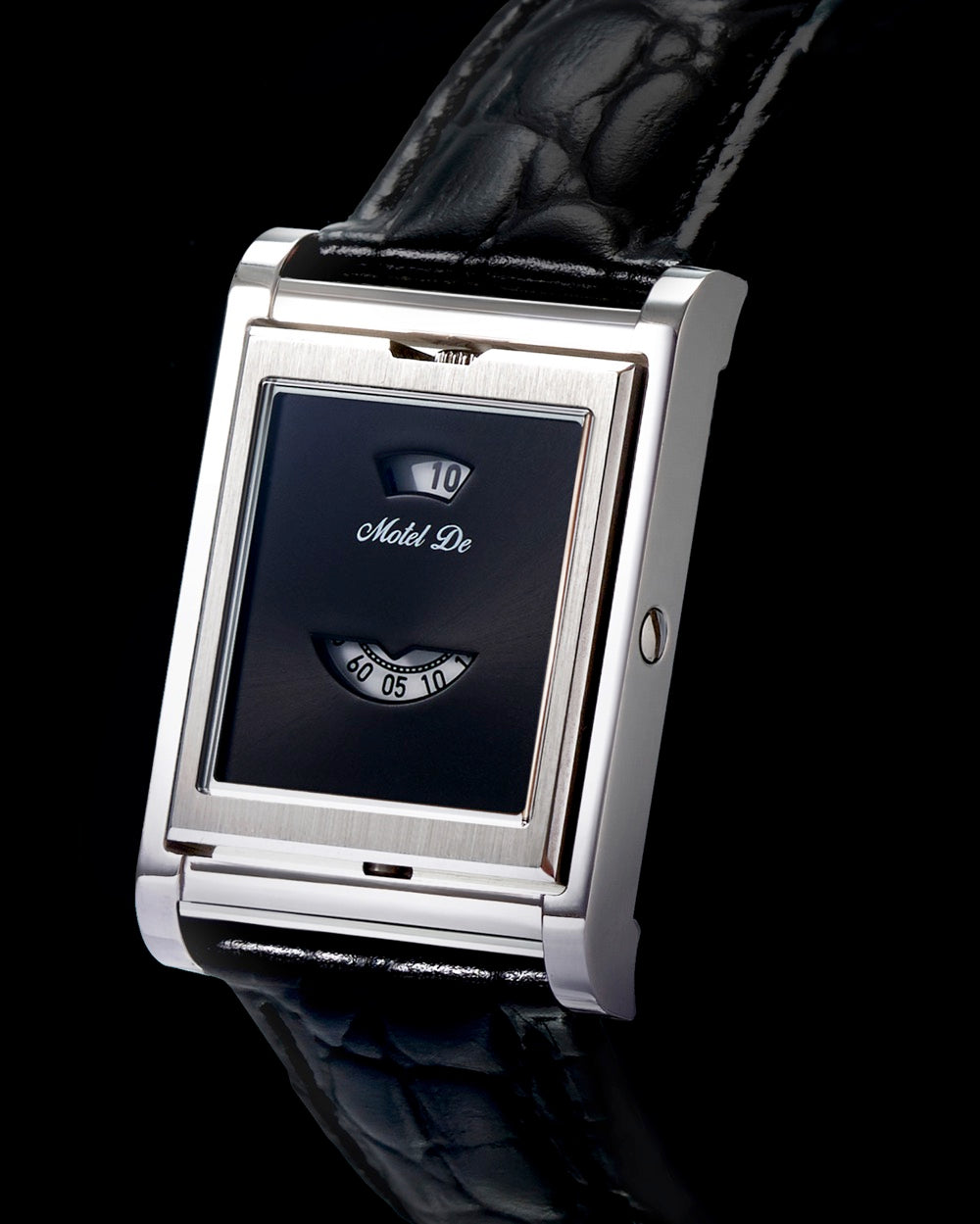 Instead of the abrupt change of a traditional jump hour, the hour disc of Motel De Eclipse rotates gradually within the upper window.