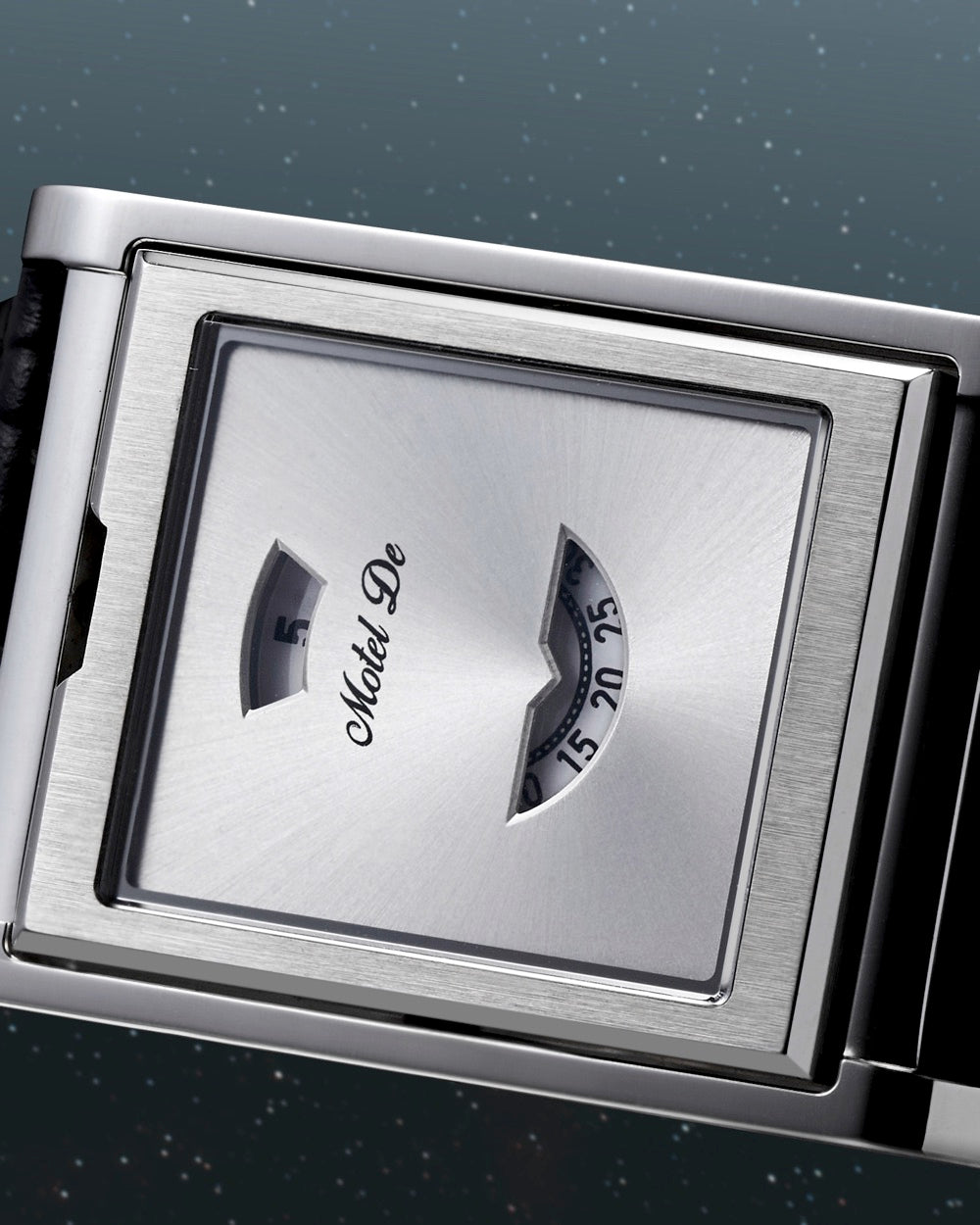 Instead of the abrupt change of a traditional jump hour, the hour disc of Motel De Eclipse rotates gradually within the upper window.