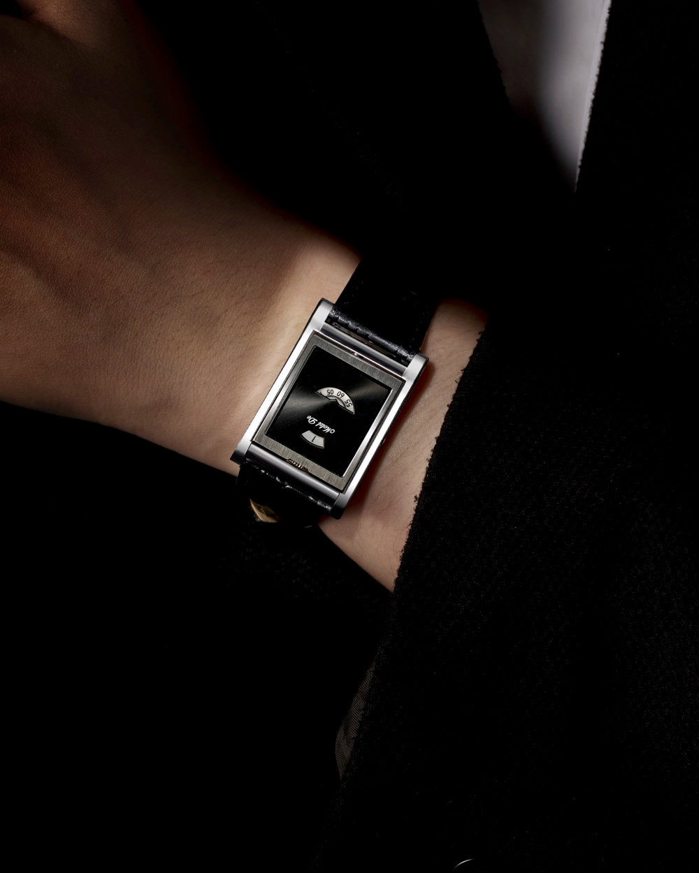 Together, the rotating hours and retrograde minutes create a dialogue of motion: one fluid, one sudden shadow and light in perfect balance.